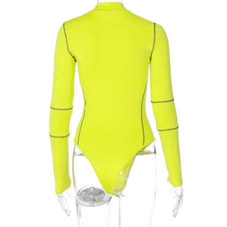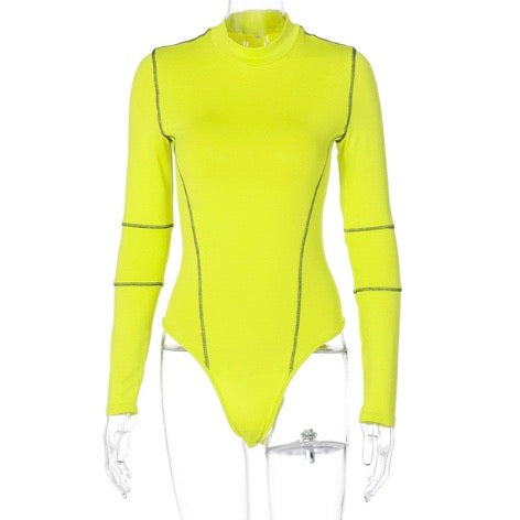 Stretchy long sleeve bodysuit.  With black patchwork stitching.  3 snap button closure.  Fits true to size.