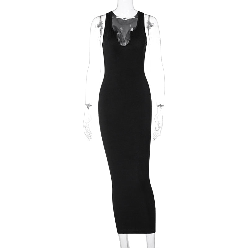 V-neck, ribbed bodycon maxi sleveless tank dress. Form fitted with some stretch. True to size.