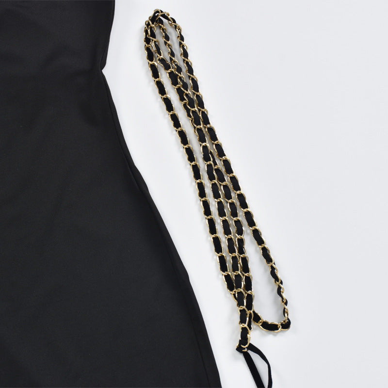 Stretchy bodycon romper/playsuit.  With chain double chain staps and matching chain belt.   Fits true to size.
