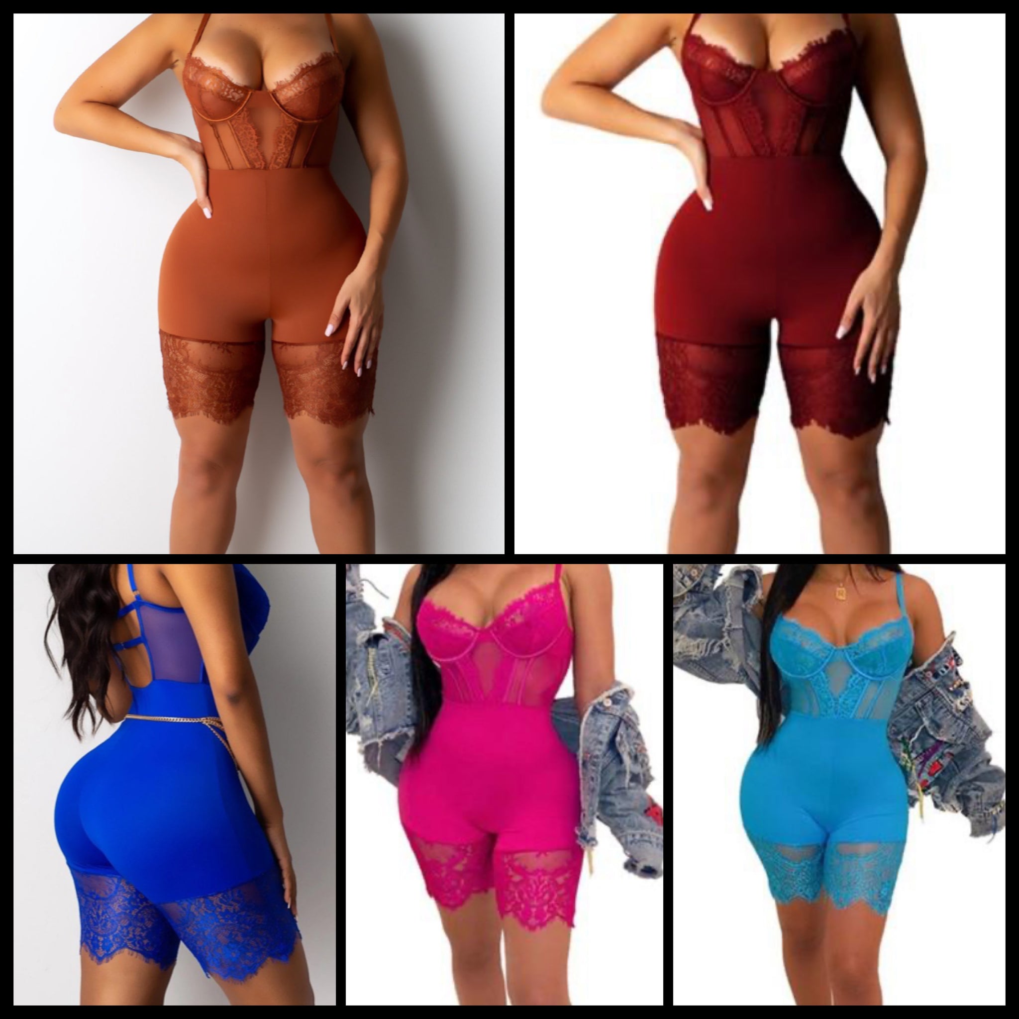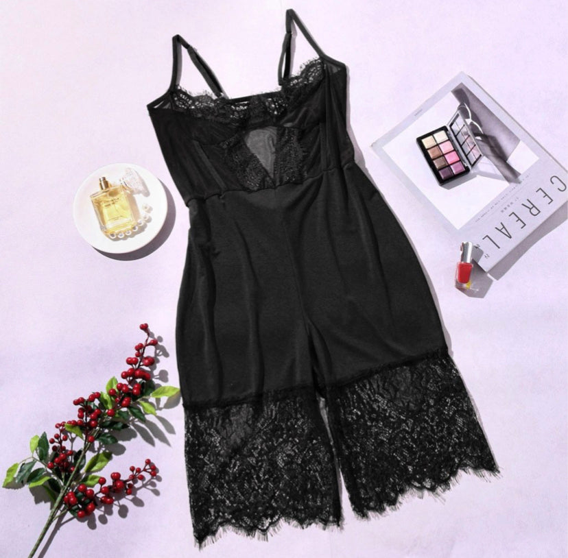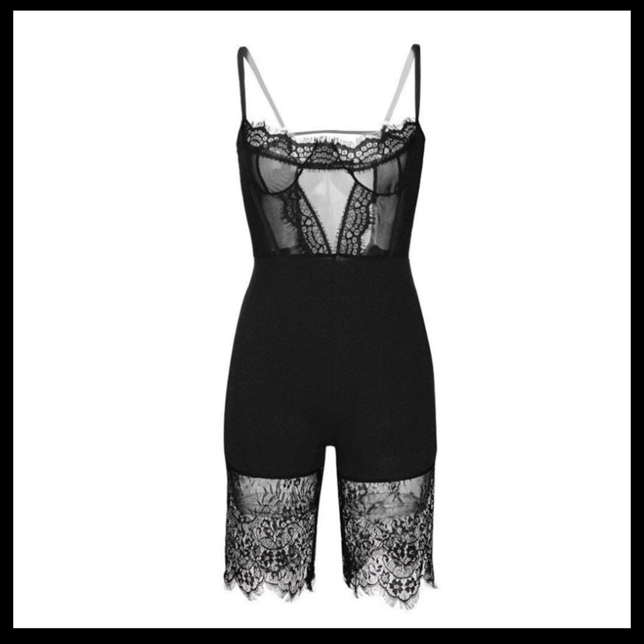 Lace playsuit. Sheer and lace front with open back. Adjustable straps. Lace on leg has slight stretch. Fits true to size.
