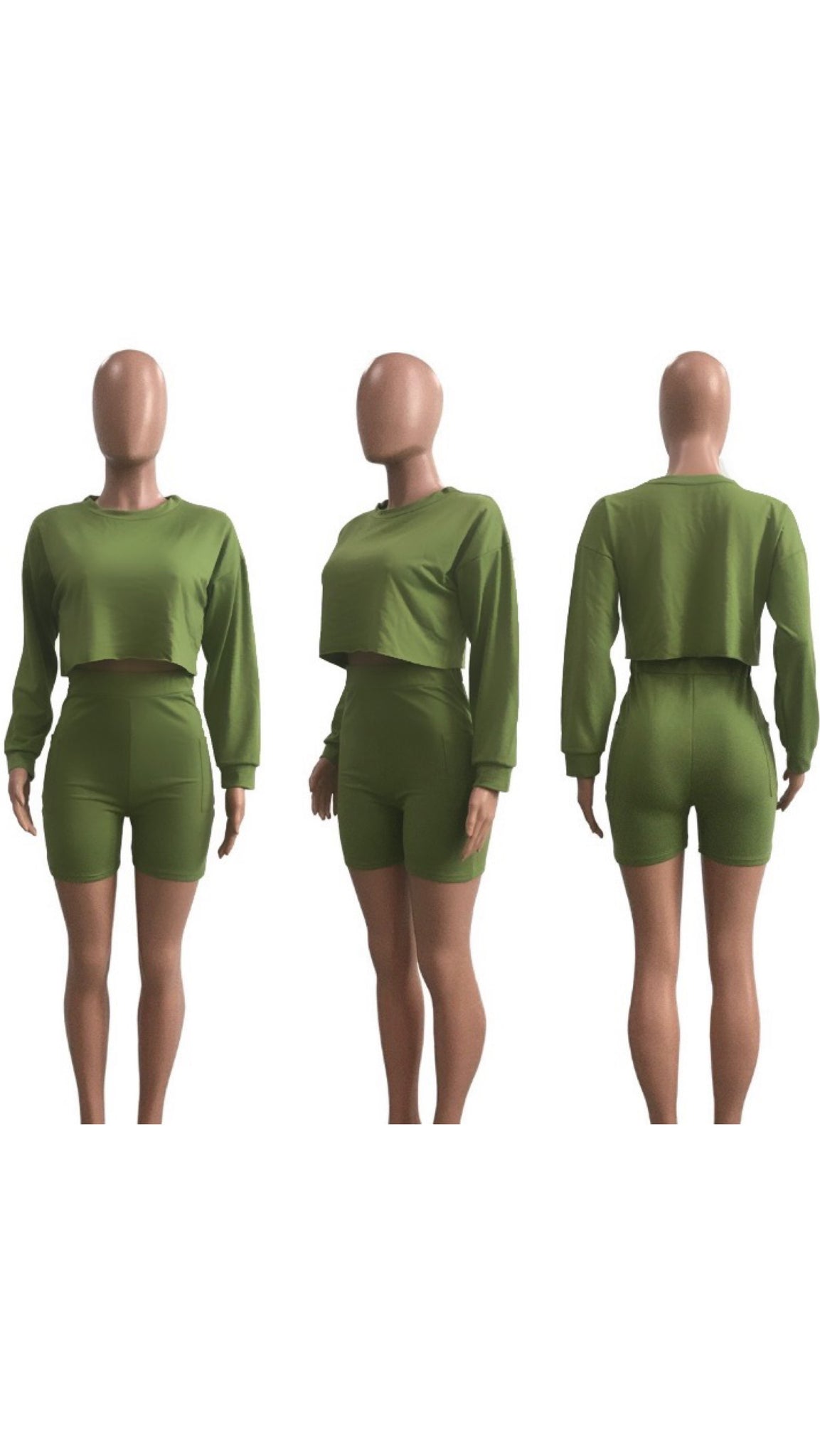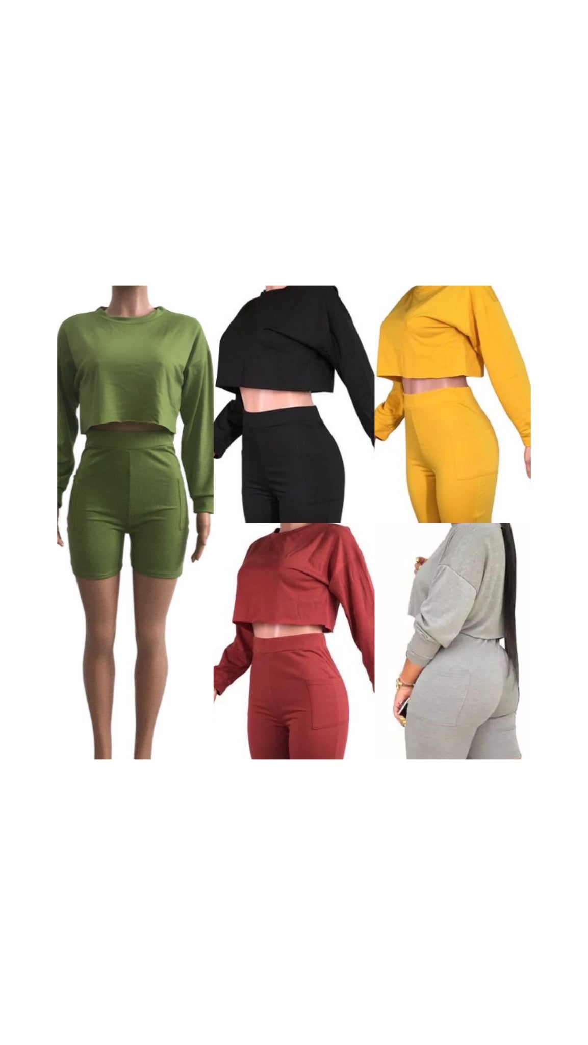 2 piece short set. With long sleeve crew neck cropped top. Matching shorts with side pockets. Good Stretch.