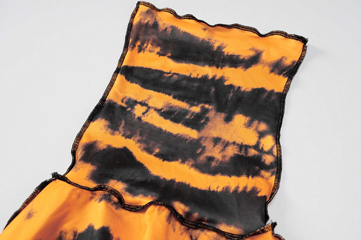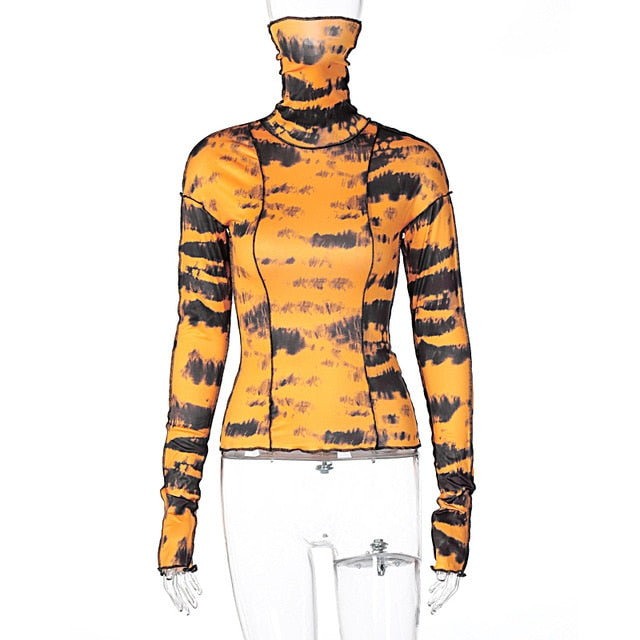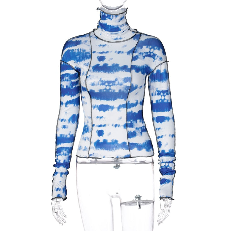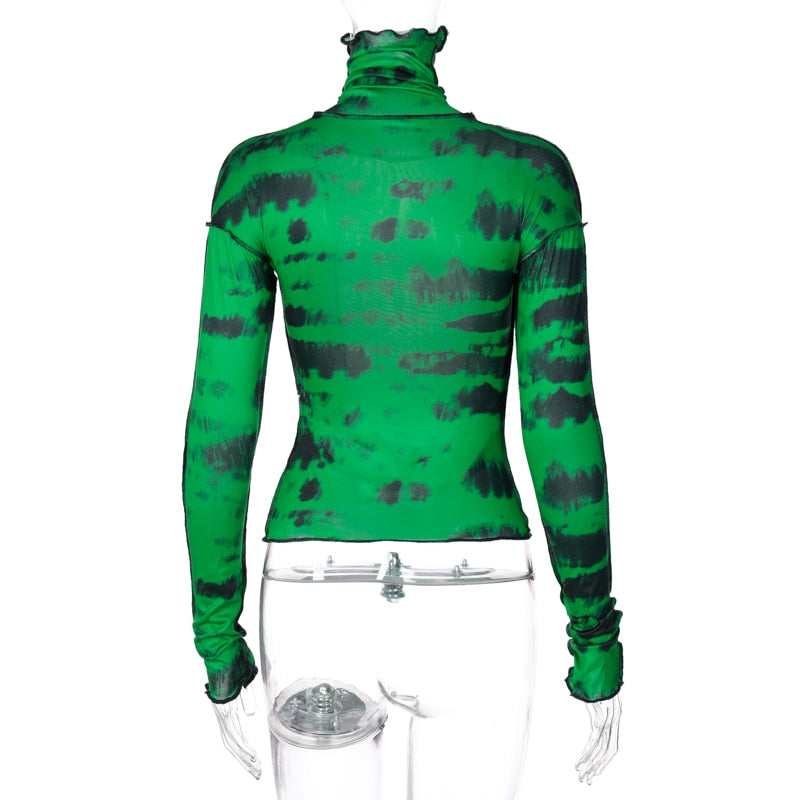 Stretchy tie dye long sleeve high neck top. With lettuce trim on sleeve, neck and waist. Fits true to size.