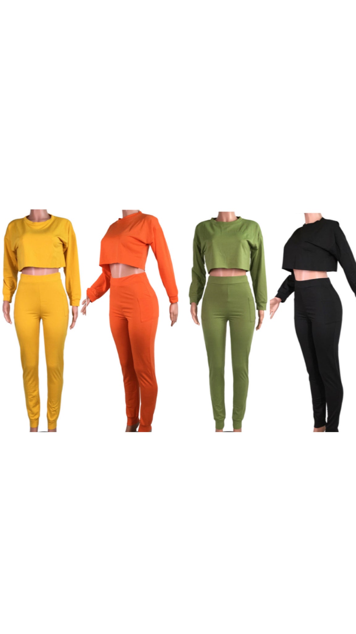 2 piece jogger set. With long sleeve crew neck cropped top and matching joggers with side pockets. Good stretch.