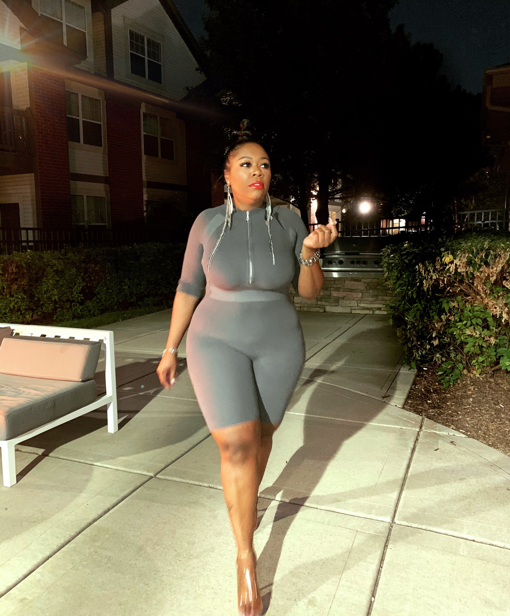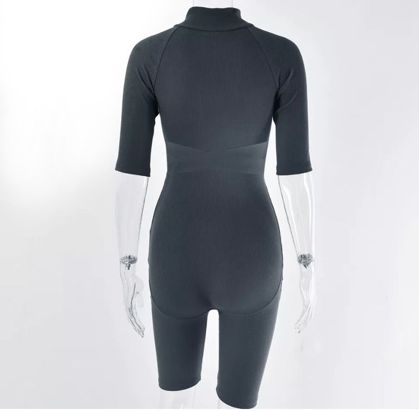 Ribbed banded bodycon playsuit.Β Β Short sleeve, mock neck and zippered front.Β Fits true to size.Β