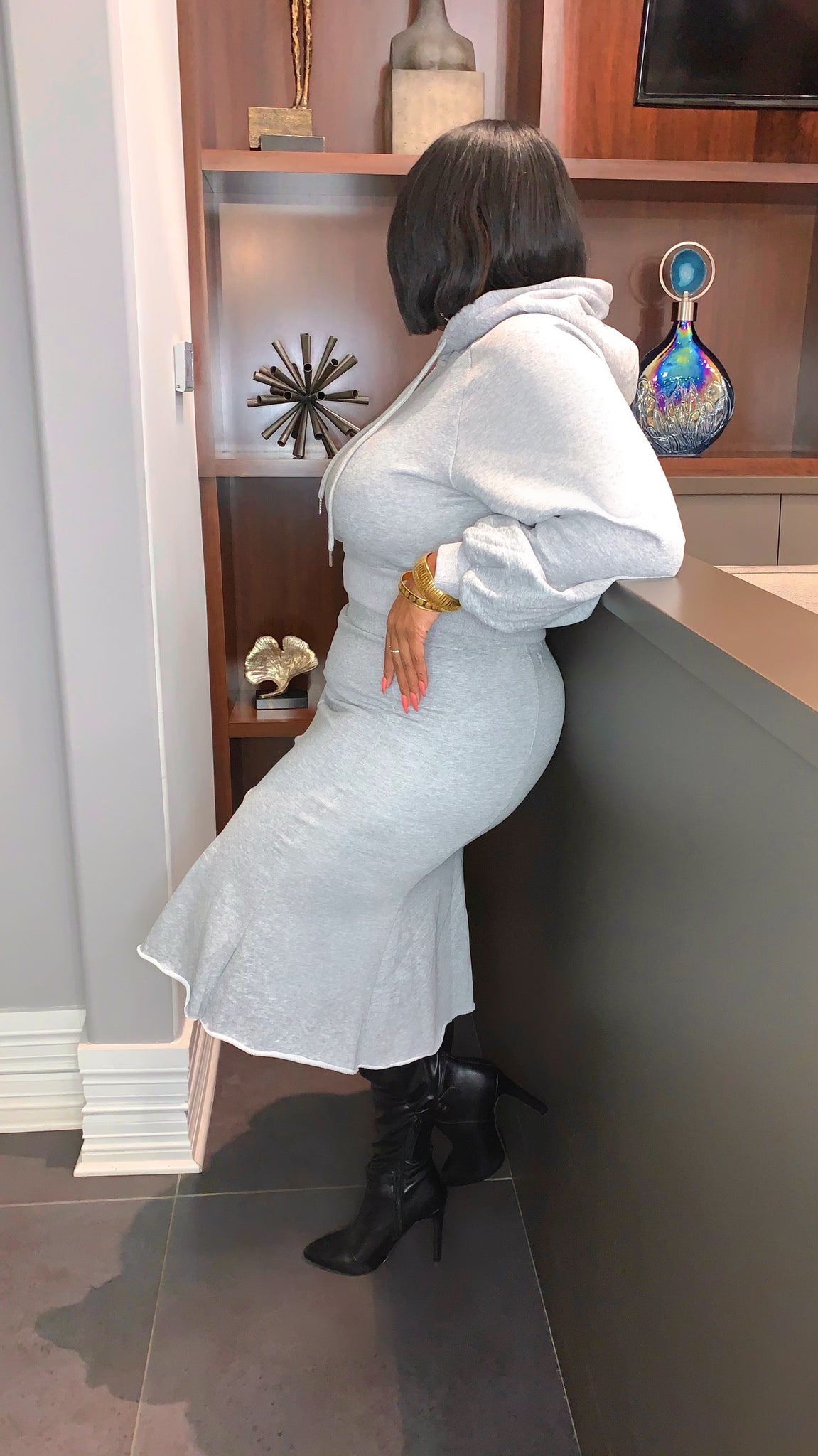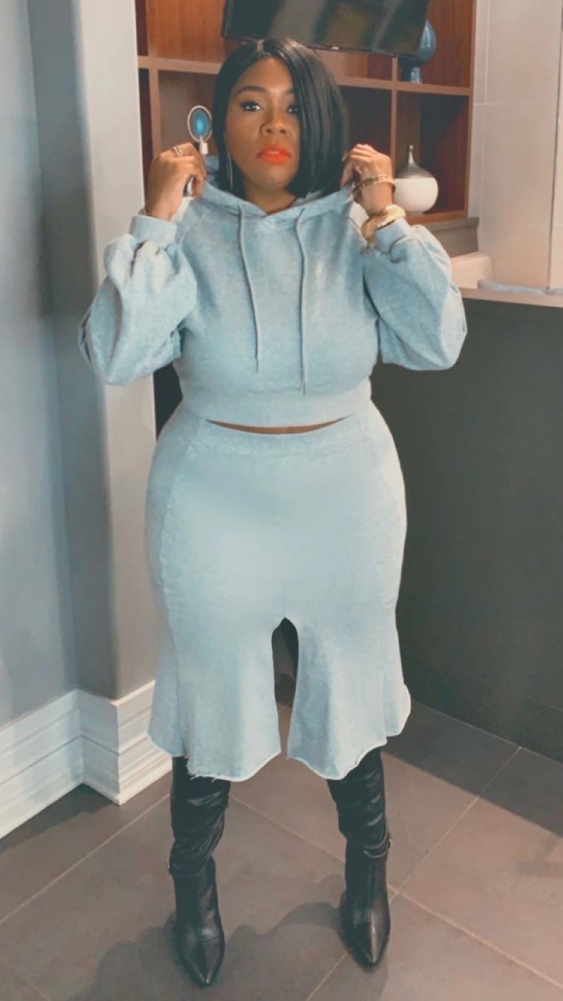2 piece skirt set. With cropped hoodie with puff sleeve and matching high slit skit. Stretchy. Fits true to size.